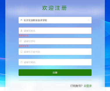 用电脑或手机设备登录网址,进行注册和比赛;学生自主注册:学校选择长沙文创艺术职业学院---填写个人信息---学号(即身份证号码)---班级---手机号---密码(密码自行填写,请记住自己填写的密码)---提交注册。